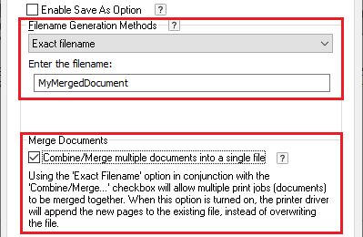 Using the Exact Filename or the Use the document name option in conjunction with the Combine/Merge… checkbox allows multiple print jobs (documents) to be merged together. When this option is turned on, the printer driver appends the new pages to the existing file instead of overwriting the file.