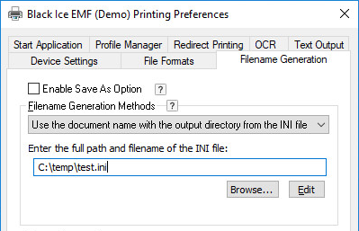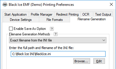 Enter the full path and filename in the INI file - Enter the INI file’s location in the “Enter the full path and filename of the INI file” field  of the printer driver “Filename Generation” tab.