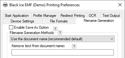 File Name = must be the exact filename. The printer driver will save the converted documents with this exact filename. The filename can be specified with or without the path. In case of specifying the filename without the path, the Printer Driver saves the file to the output directory configured in Control Panel > Printers and Devices > right click on the Printer > Printing Preferences > Filename Generation > Output Directory.