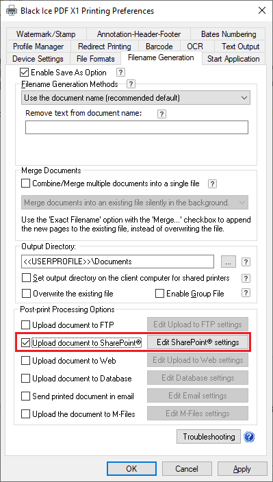 To configure the Printer Driver to upload the printed documents directly to SharePoint, please navigate to the Filename Generation tab on the Printing Preferences window, and enable the Upload document to SharePoint option.