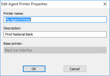 After an Agent Printer is created, the Printer Name and Description can be edited at any time. To edit an Agent Printer, highlight it in the Available Agent Printers section and click Edit…. (The base printer is grayed out and cannot be edited.)
