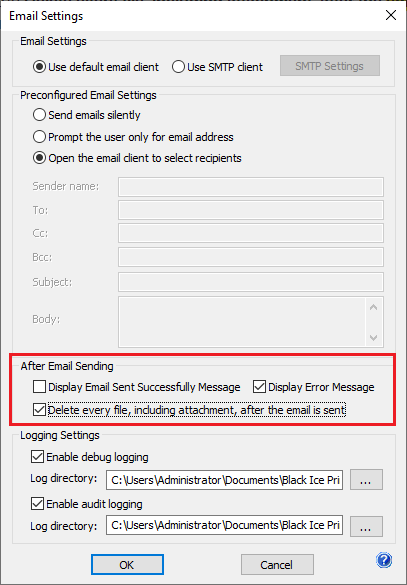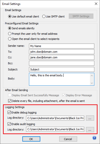 If the Send emails silently option is enabled, users can preconfigure the email preferences including the Sender name, To, Cc, Bcc, Subject and Body, which results silent email sending without any user interaction. If the user prints to the Black Ice Printer Driver will send the email in the background.