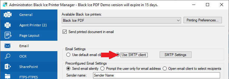 On this tab choose whether to use the default email client for email sending, or connect to an SMTP server. If the user chooses the Use SMTP client option, the SMTP Settings button appears. By clicking on it, the SMTP settings can be configured under the SMTP Settings tab.