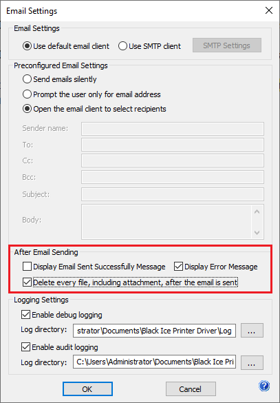 If the Delete every file, including attachment, after the email is sent option is enabled, the Printer Driver will delete the printed document and attachments after the email is sent successfully.