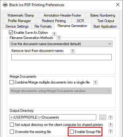 To disable group file generation in the Black Ice Printer Drivers, go to the Control Panel > Printers and Devices > right click on the Black Ice Printer Driver > Printing Preferences… > Filename Generation and make sure the Enable Group File option is unchecked.