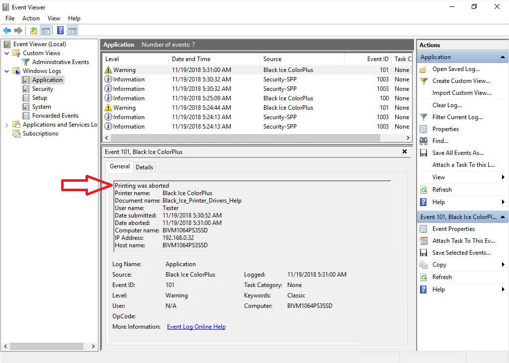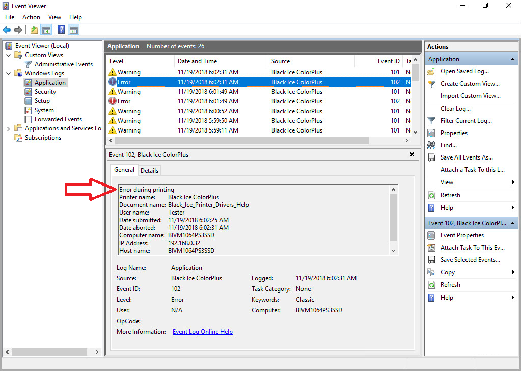 Set the "Event Logging Level" in the printer driver INI file to 1 or 2 or 3, in order to generate event if an error occurs during printing.