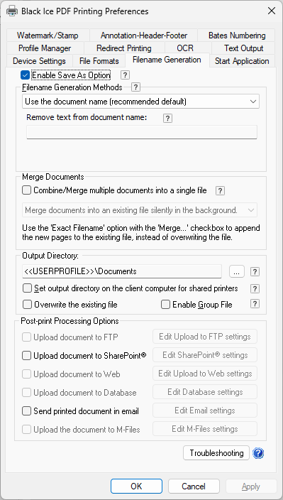 The Black Ice Printer Drivers provide complete control over the names of the files generated when printing. On the Filename Generation tab, the user is able to configure the Upload and Email options.