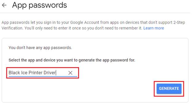 On the next screen, one can enter a name for the app password (for example, Black Ice Printer Driver). Click on the Generate button to create an app password.