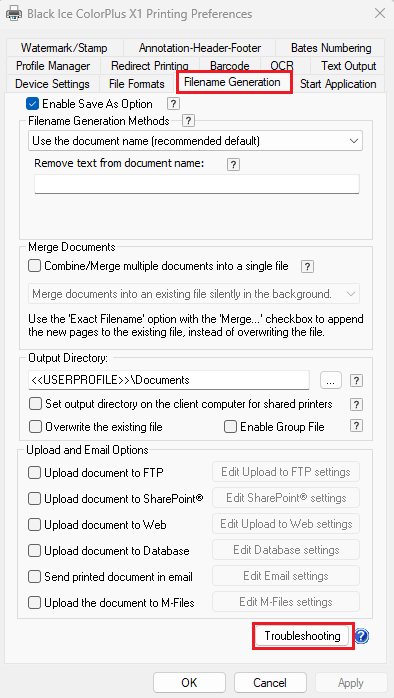 Click the “Troubleshooting” button on the “Filename Generation” tab.