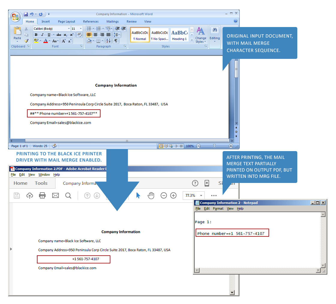 In addition, an output text file is generated containing the extracted text from the printed document including the mail merge characters.