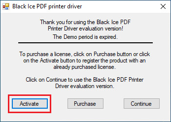 To register the Printer Driver during the demo period, click on the Activate button on the splash screen when launching the Printer Driver (registration requires administrator privileges).