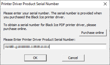 A window is displayed to Enter the serial number in the text field and press OK. The serial number can be found in the email body of the containing the download instructions for Printer Driver.