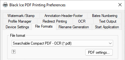 To navigate to the PDF Settings, go to the File Formats tab, select the Searchable Compact PDF file format and click PDF settings…